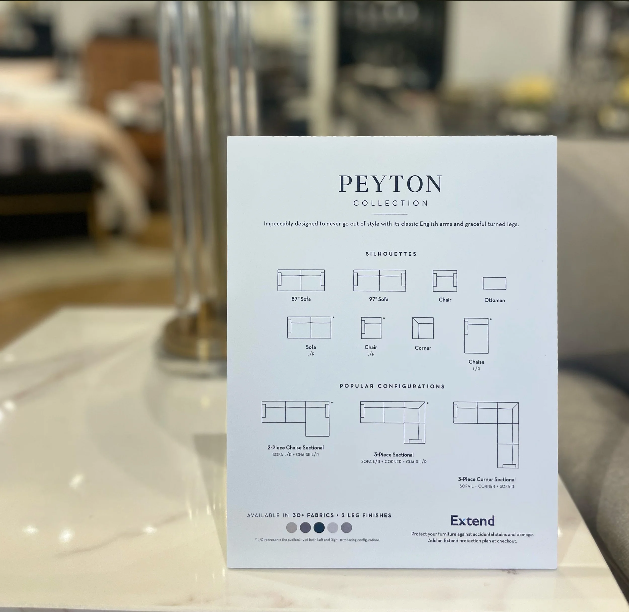 Develop a family of signs, from large-format brand story panels like the bold "Art First, Always" floor sign, to intimate product call-outs like the "Time to Unwind" tray card, to detailed collection guides like the Peyton silhouette and configuration card, each designed with restrained typography, white space, and brand-consistent layouts that felt premium without overwhelming the product.
